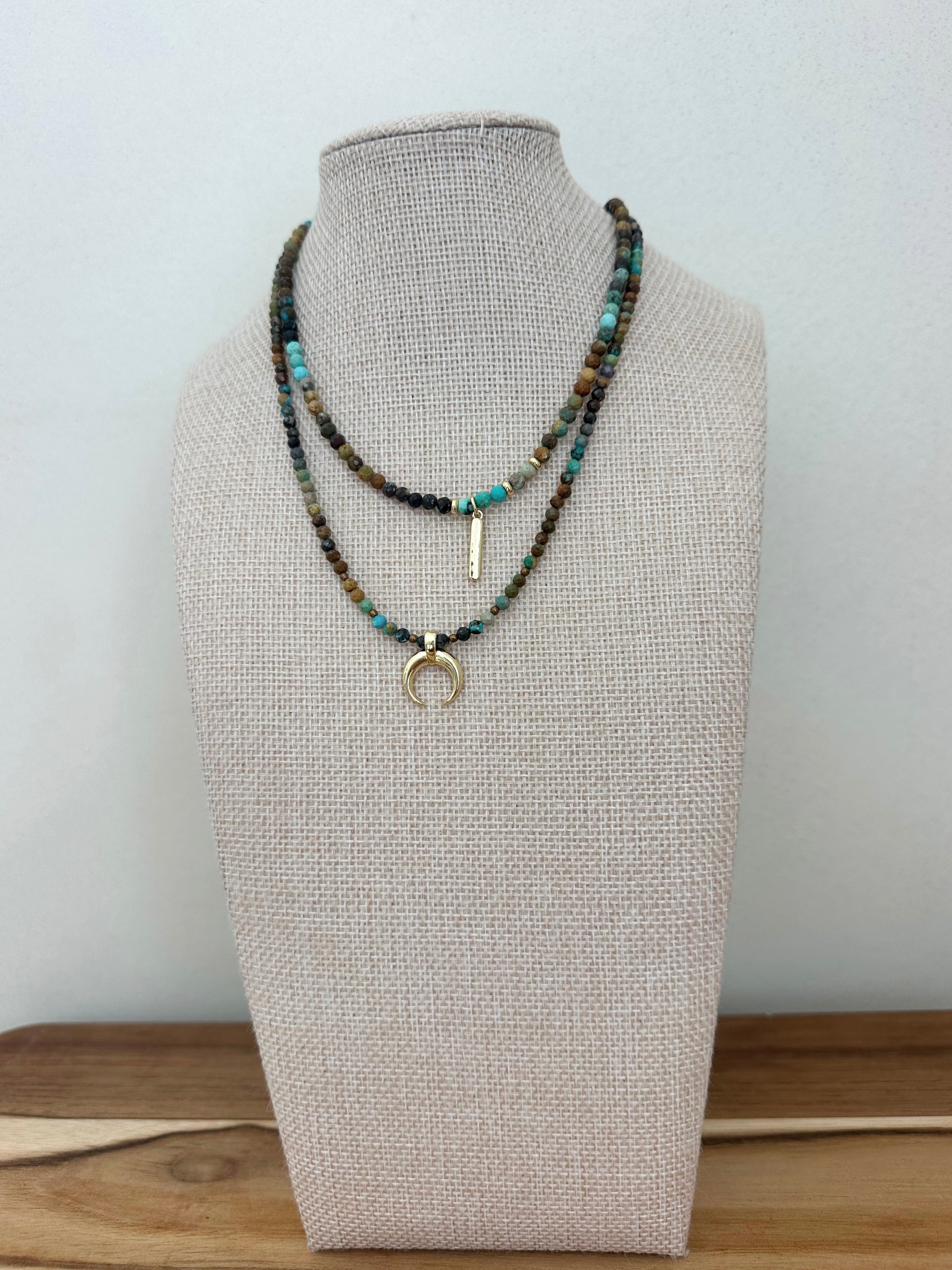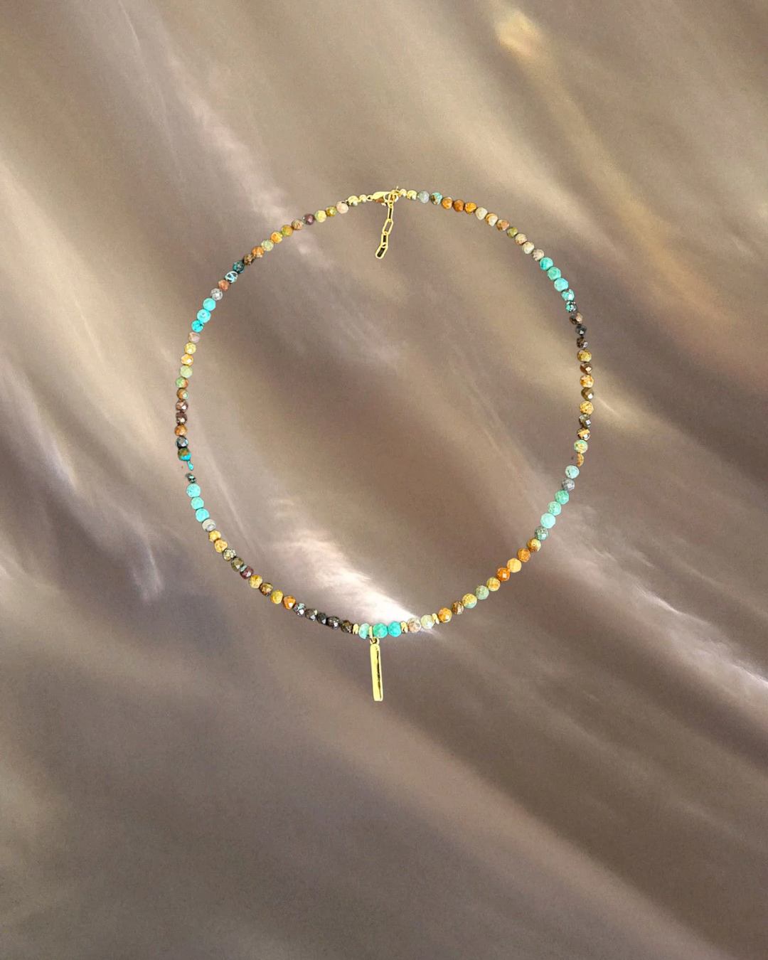Turquoise and earthy stone beads with a gold bar charm — sharp and adventurous, like stolen treasure under the desert sun.