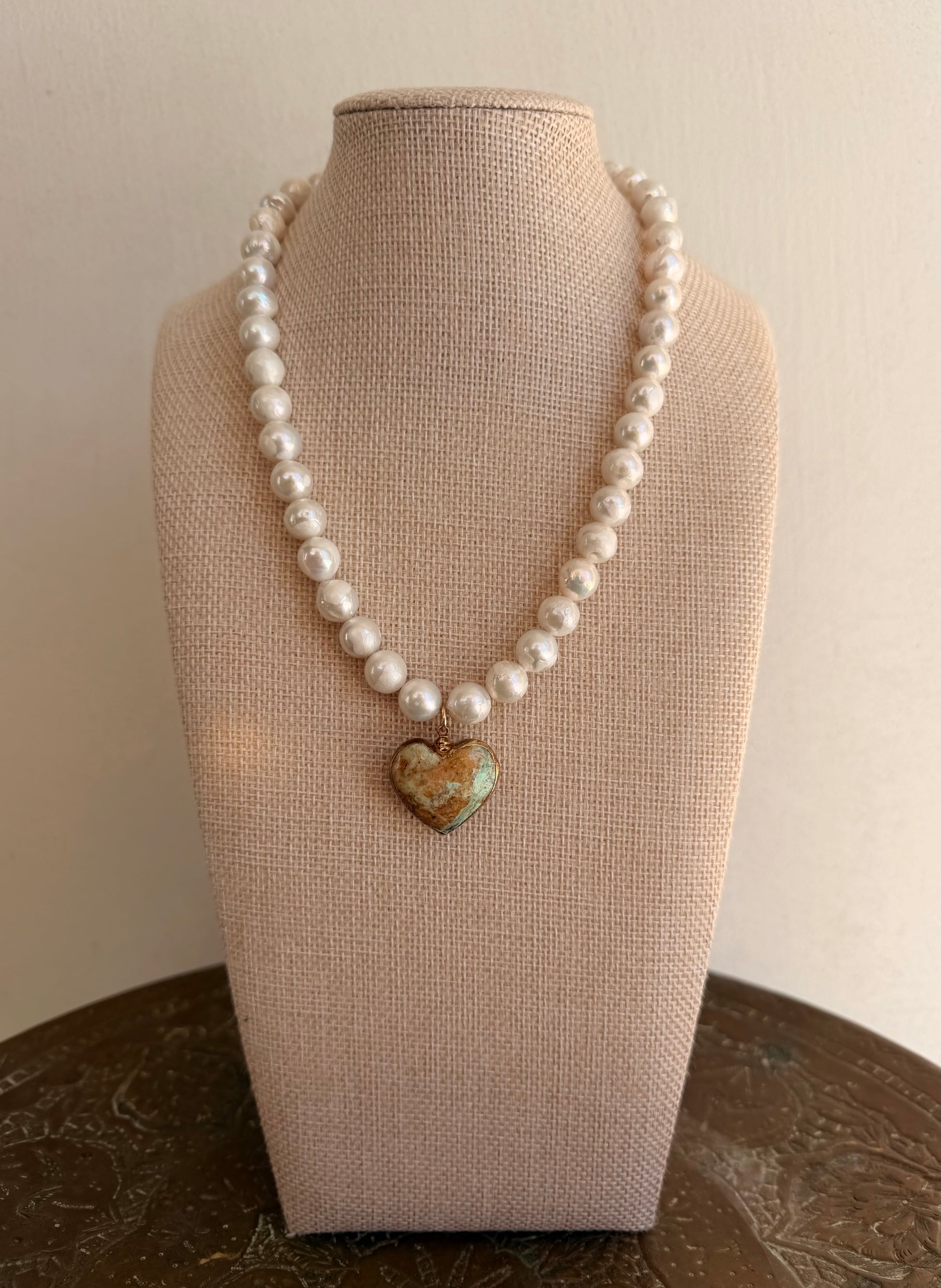 Large freshwater pearls paired with a chunky turquoise heart and finished in 18k gold-filled details. 18-19.5 inches