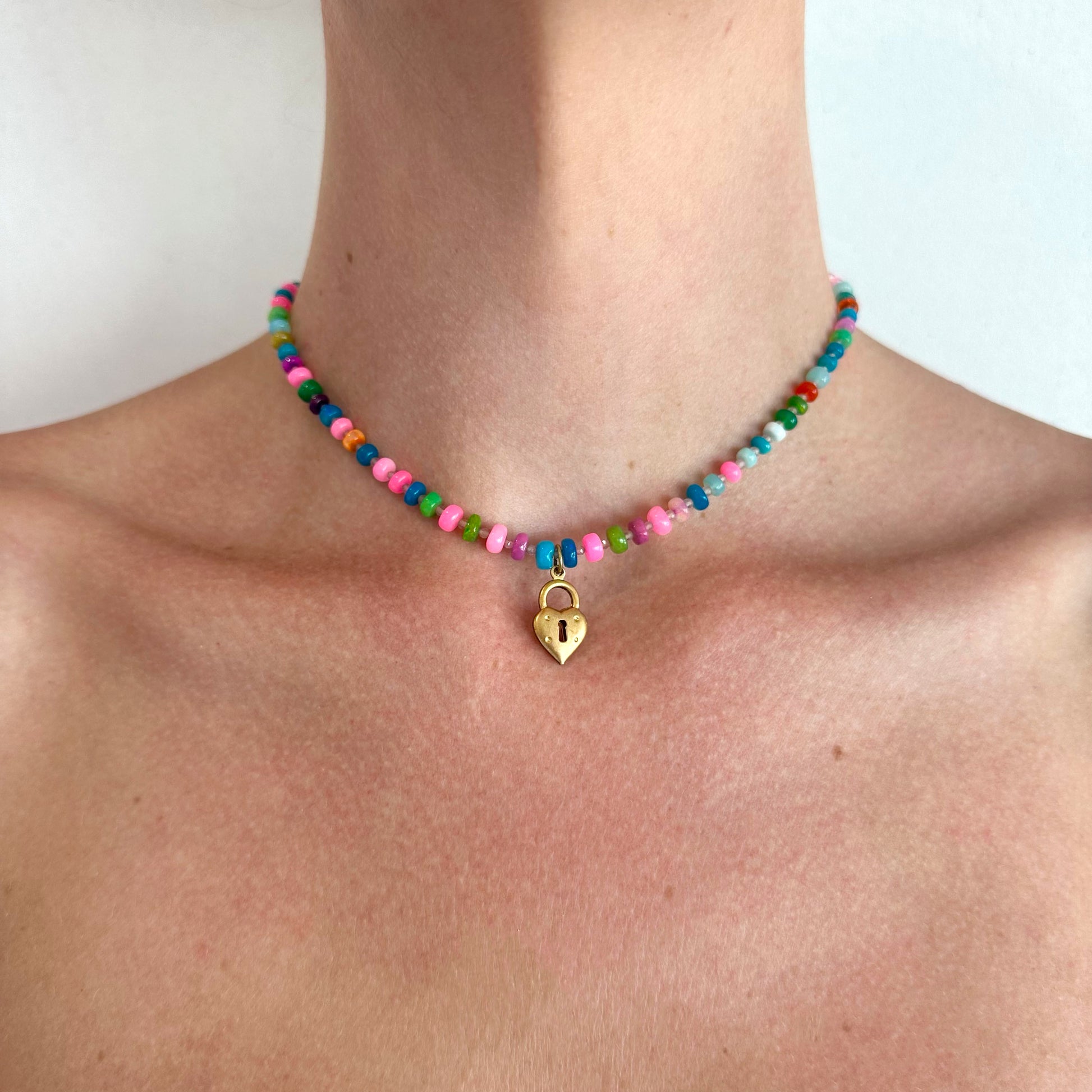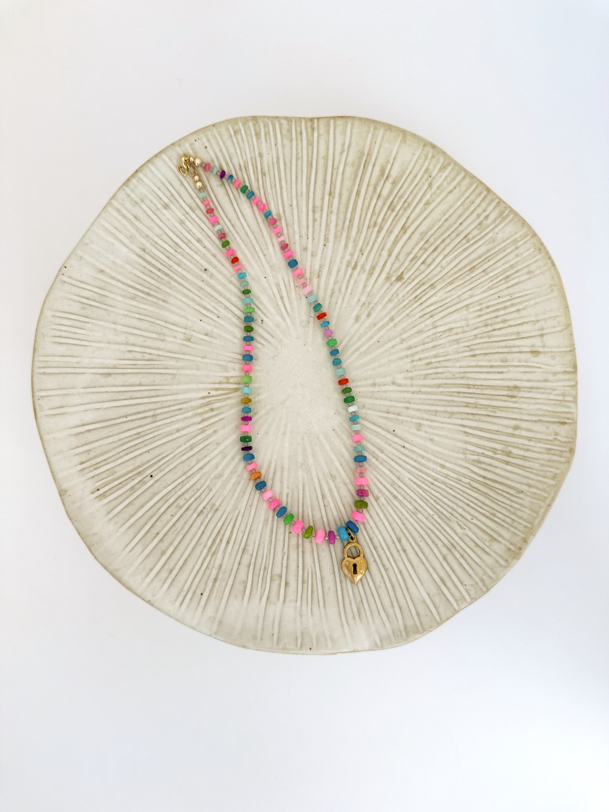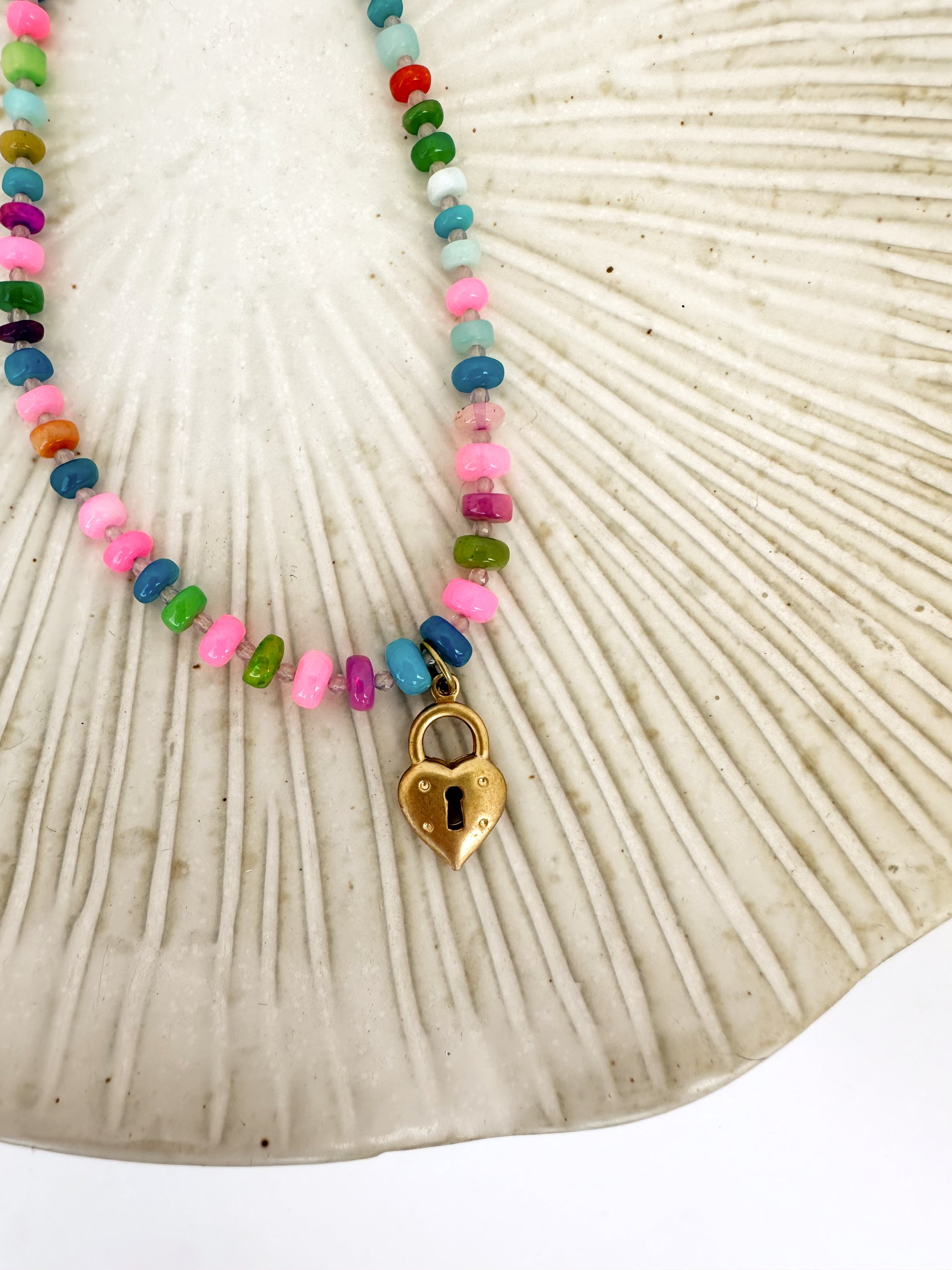 This eye catching piece is crafted with an array of rainbow opal gemstones and accented by lavender quartz beads, creating a striking and colorful display. At its heart lies a charming brass heart locket, adding a touch of vintage allure. Finished with a gold-filled claps for a secure wear, the Desert Sunset necklace is perfect for the bold and stylish Salty Cowgirl.