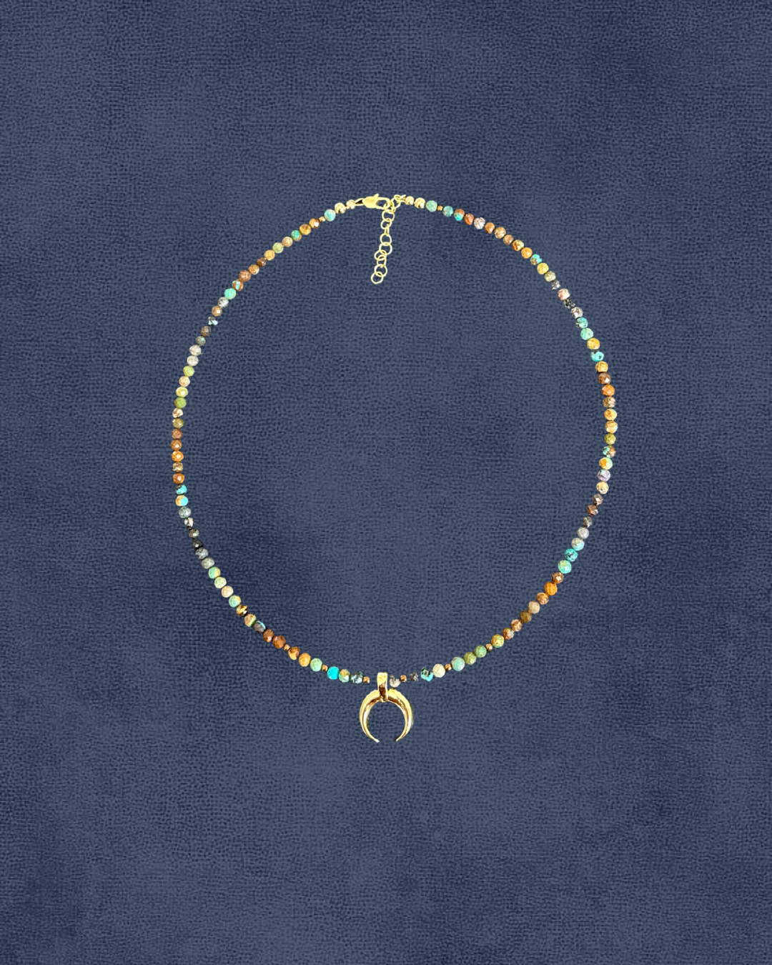 Vibrant variety of turquoise beads accented with a cute gold-filled Luna crescent.