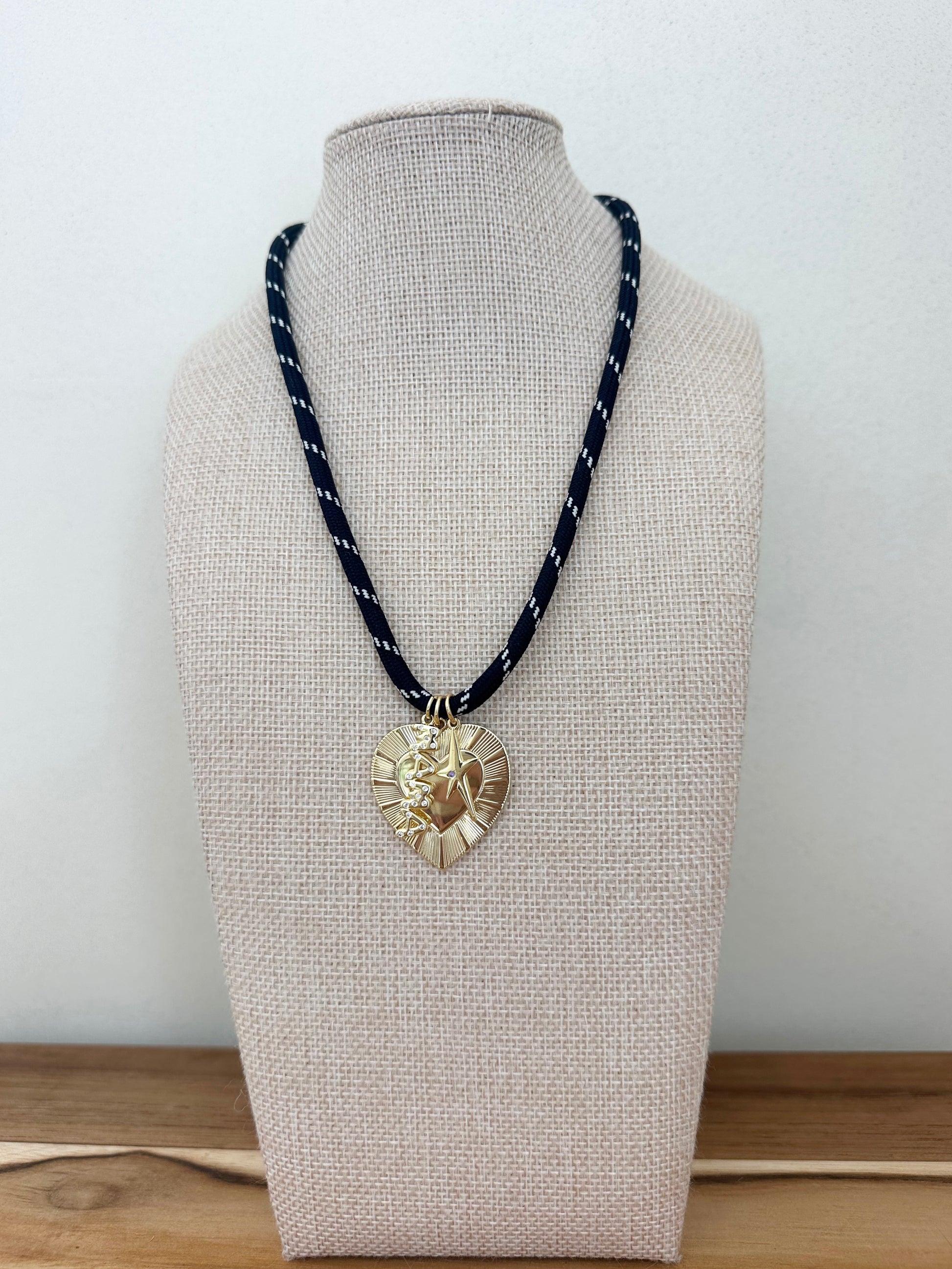 Bold navy rope necklace featuring an 18k gold-filled radiant heart pendant, accented with a star and “mama” charm — a striking mix of strength and sentiment.