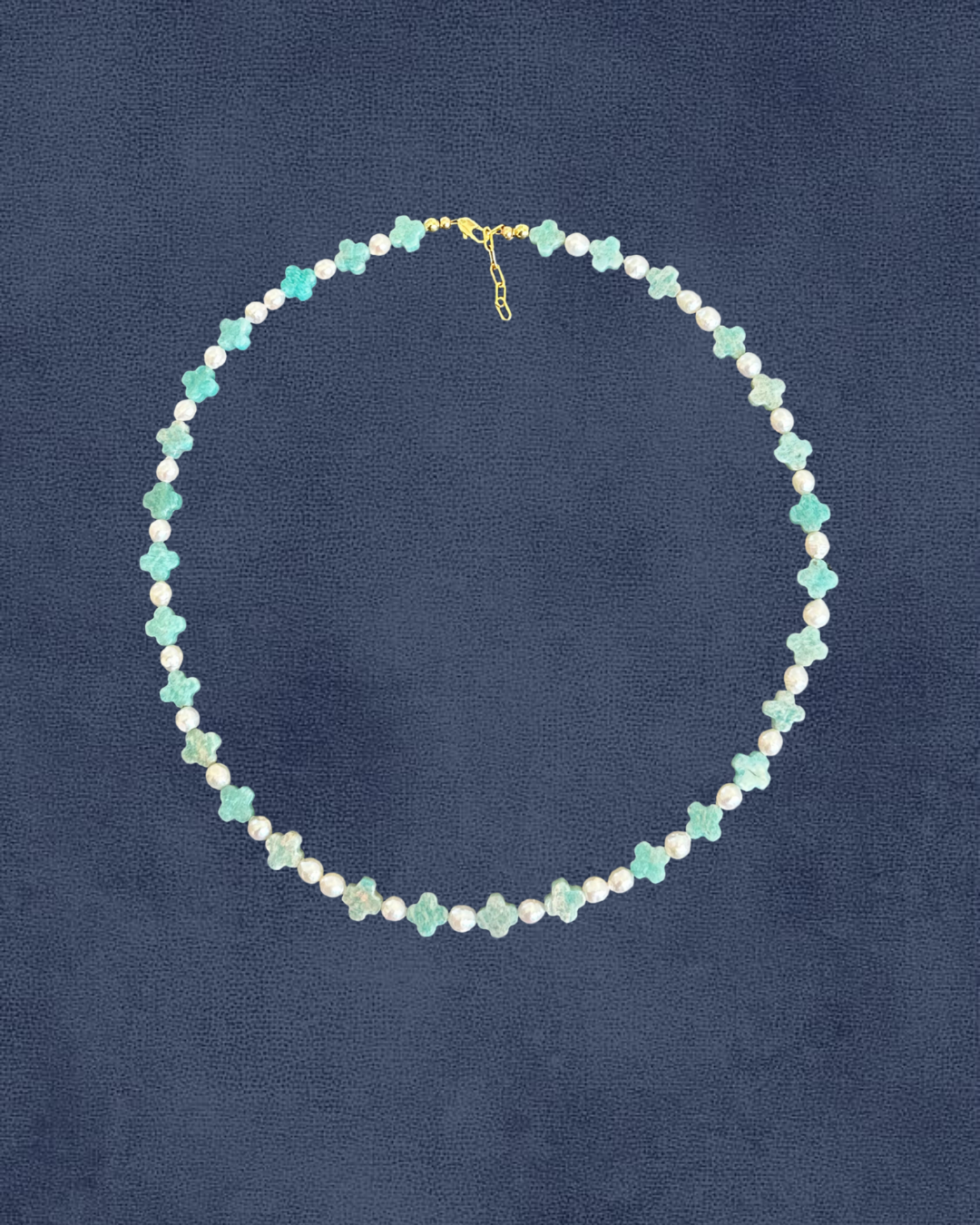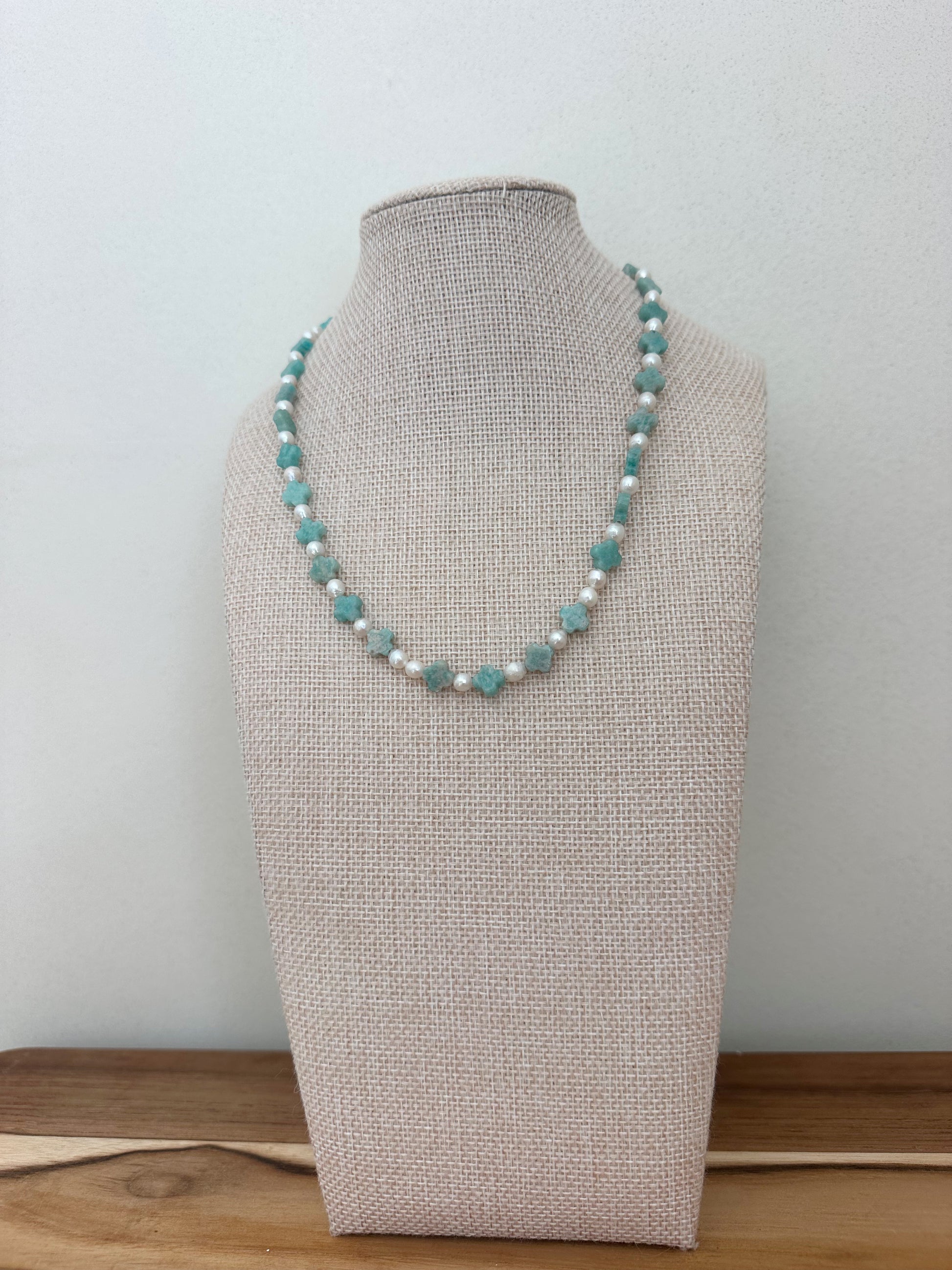 Soft pearls meet dreamy amazonite for a coastal cowgirl shimmer. Gold-filled clasp