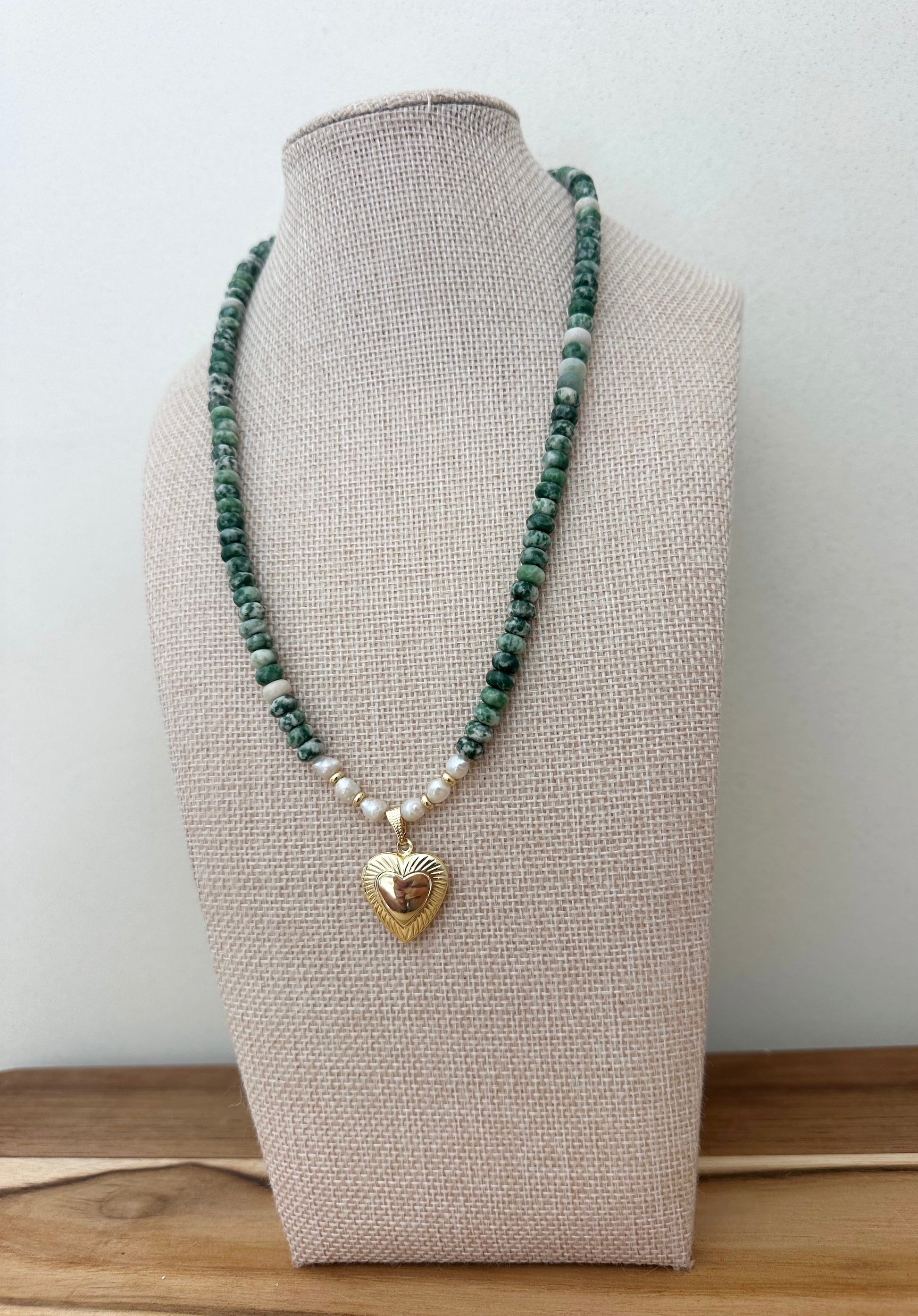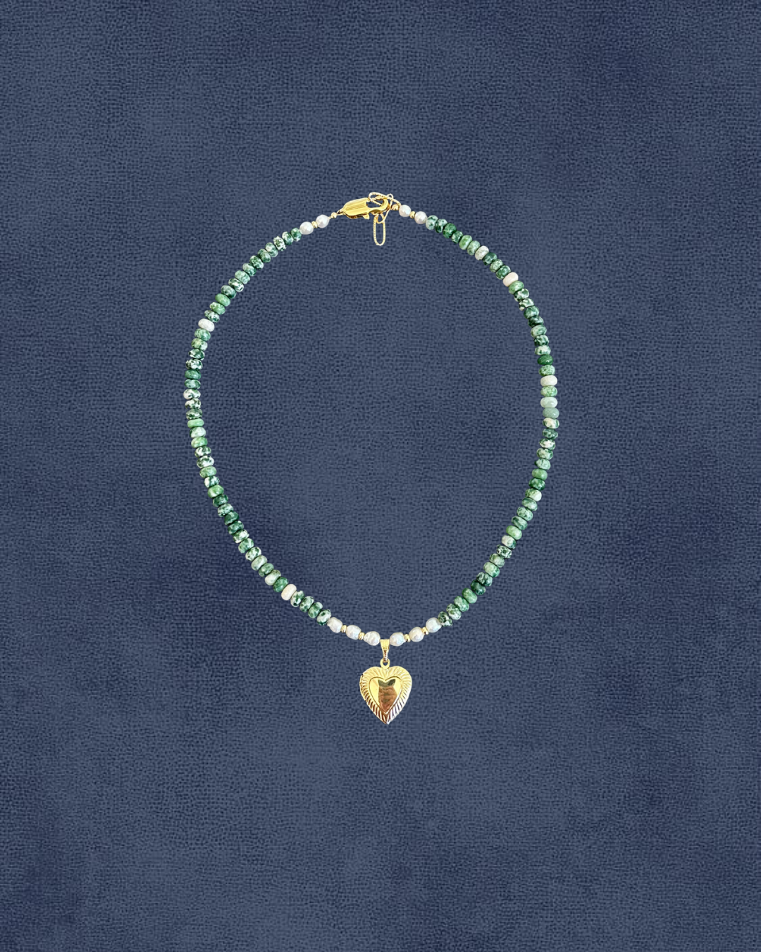 Green agate beads with glowing gold-filled heart locket — a bold piece with a touch of rebellion, perfect for a bandit queen.
