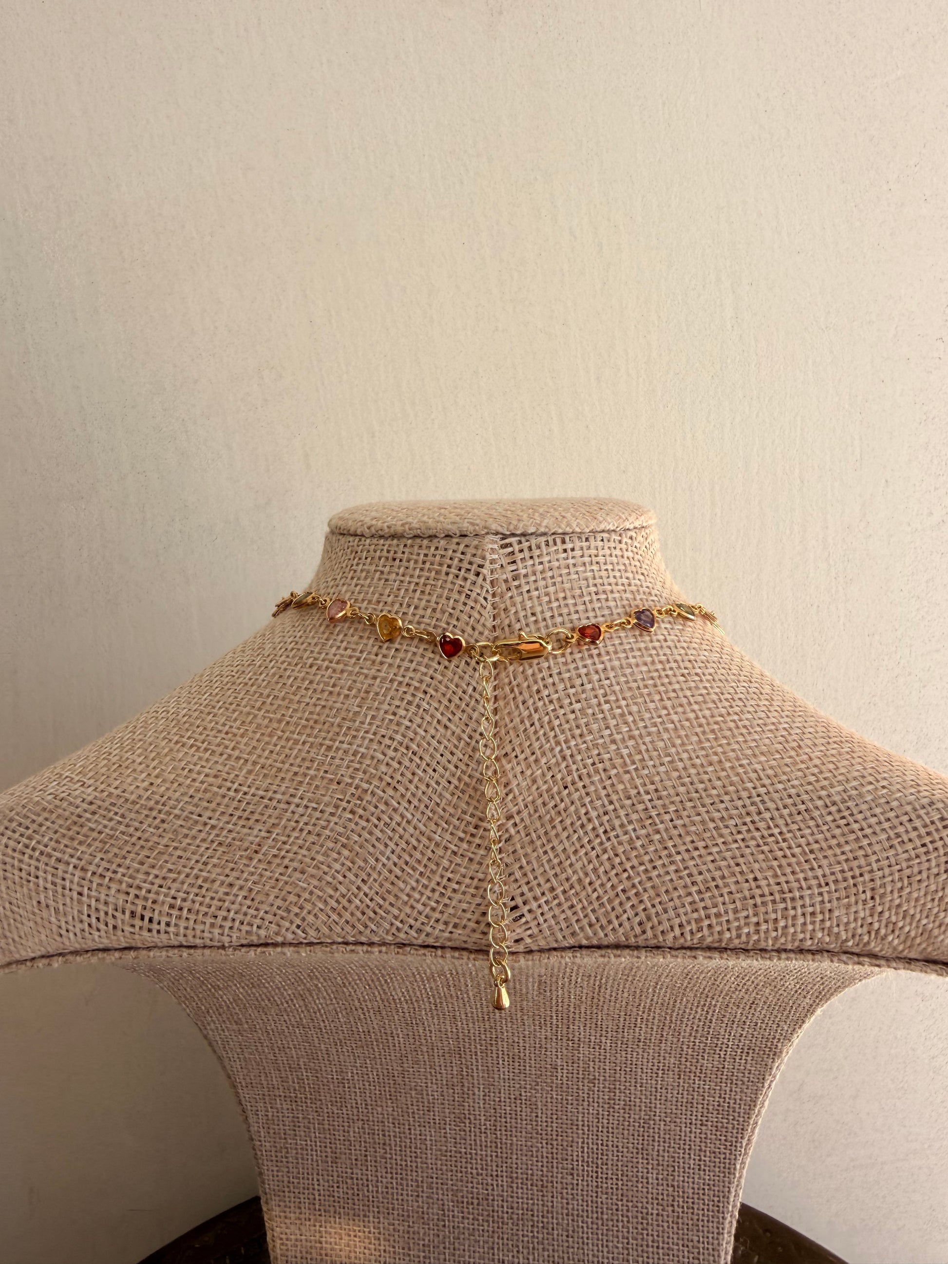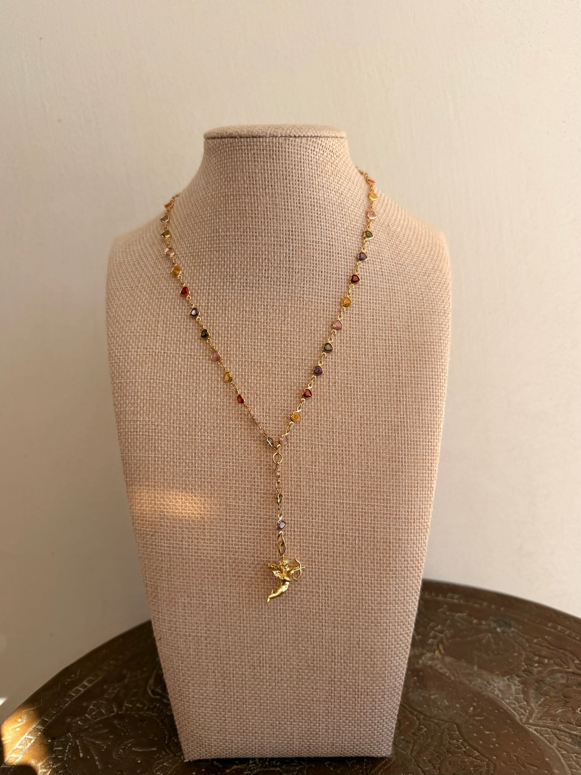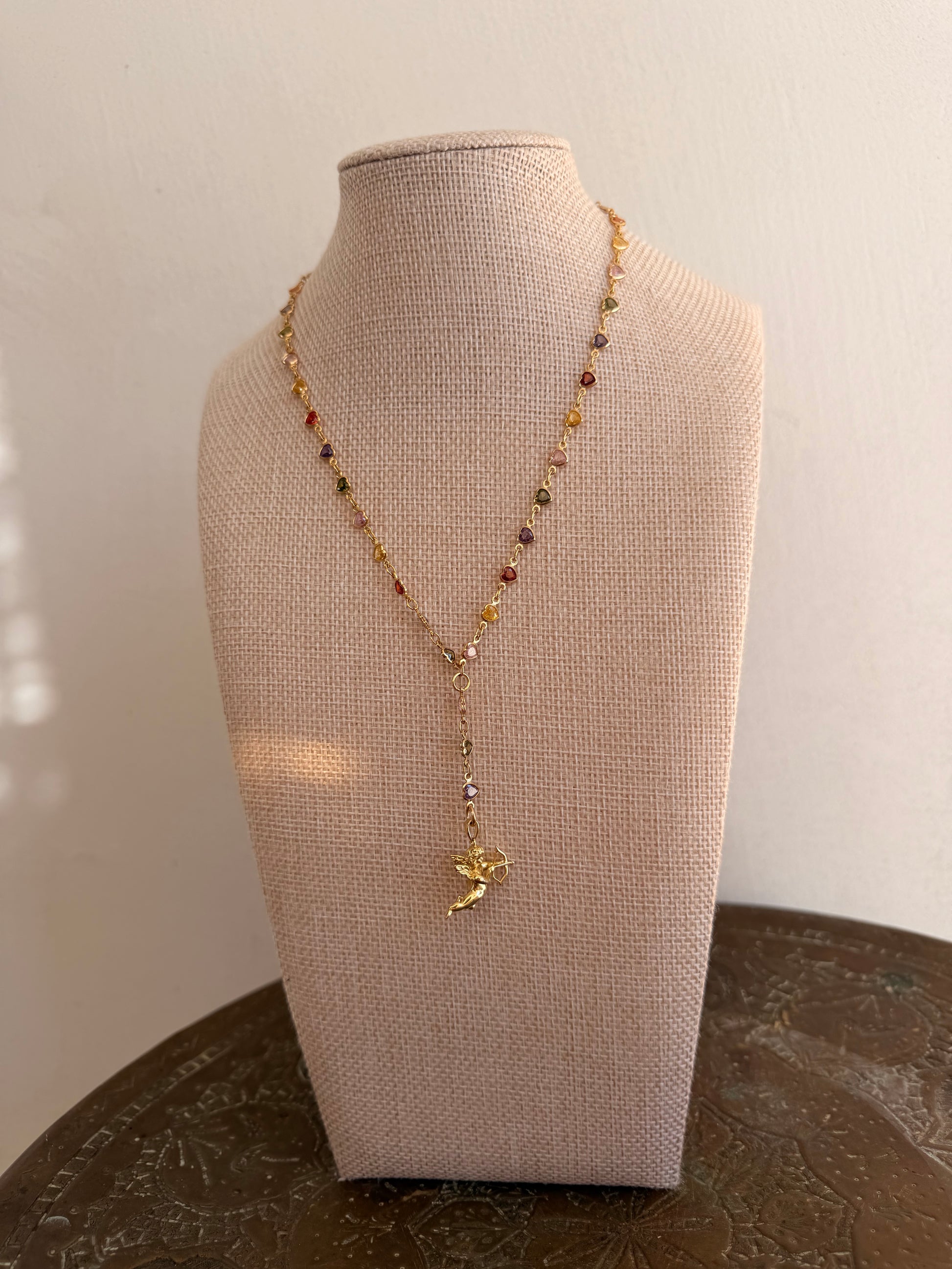 18k gold-filled lariat with multicolor crystal stations and a petite Cupid charm.