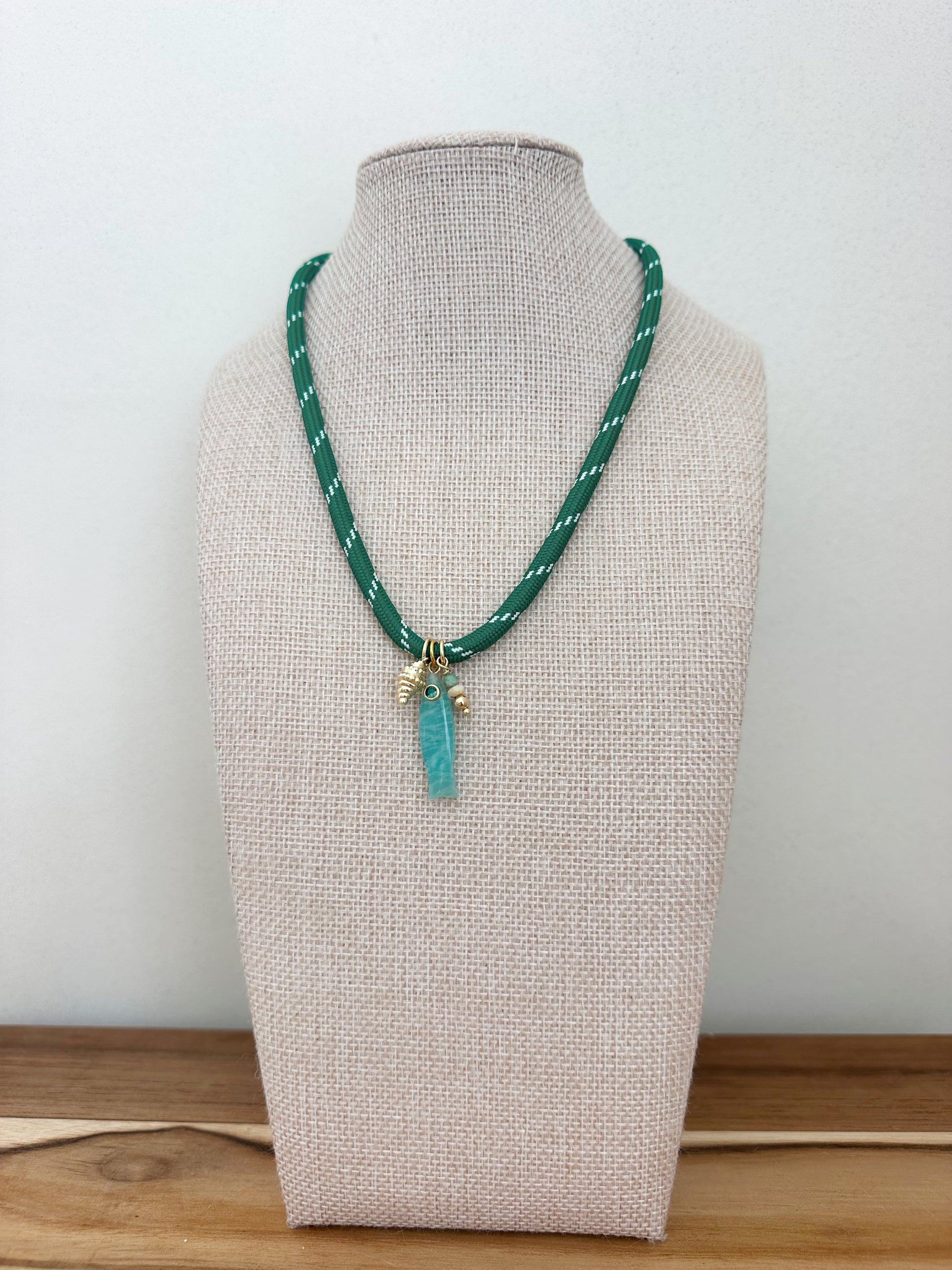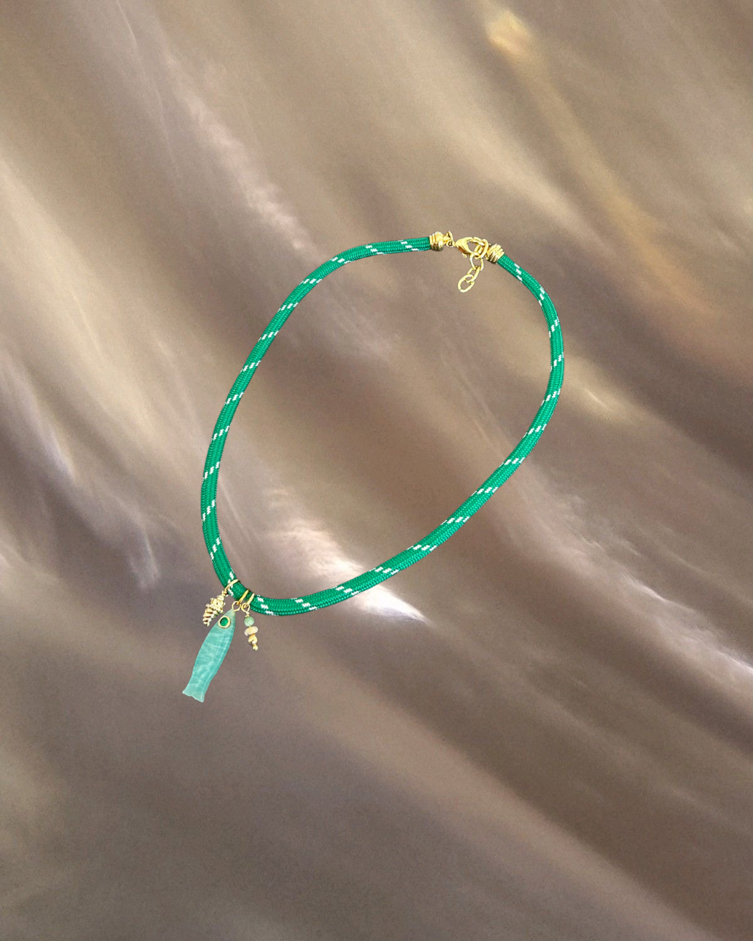 A green rope strand with a carved amazonite fish — a lucky outlaw’s treasure.