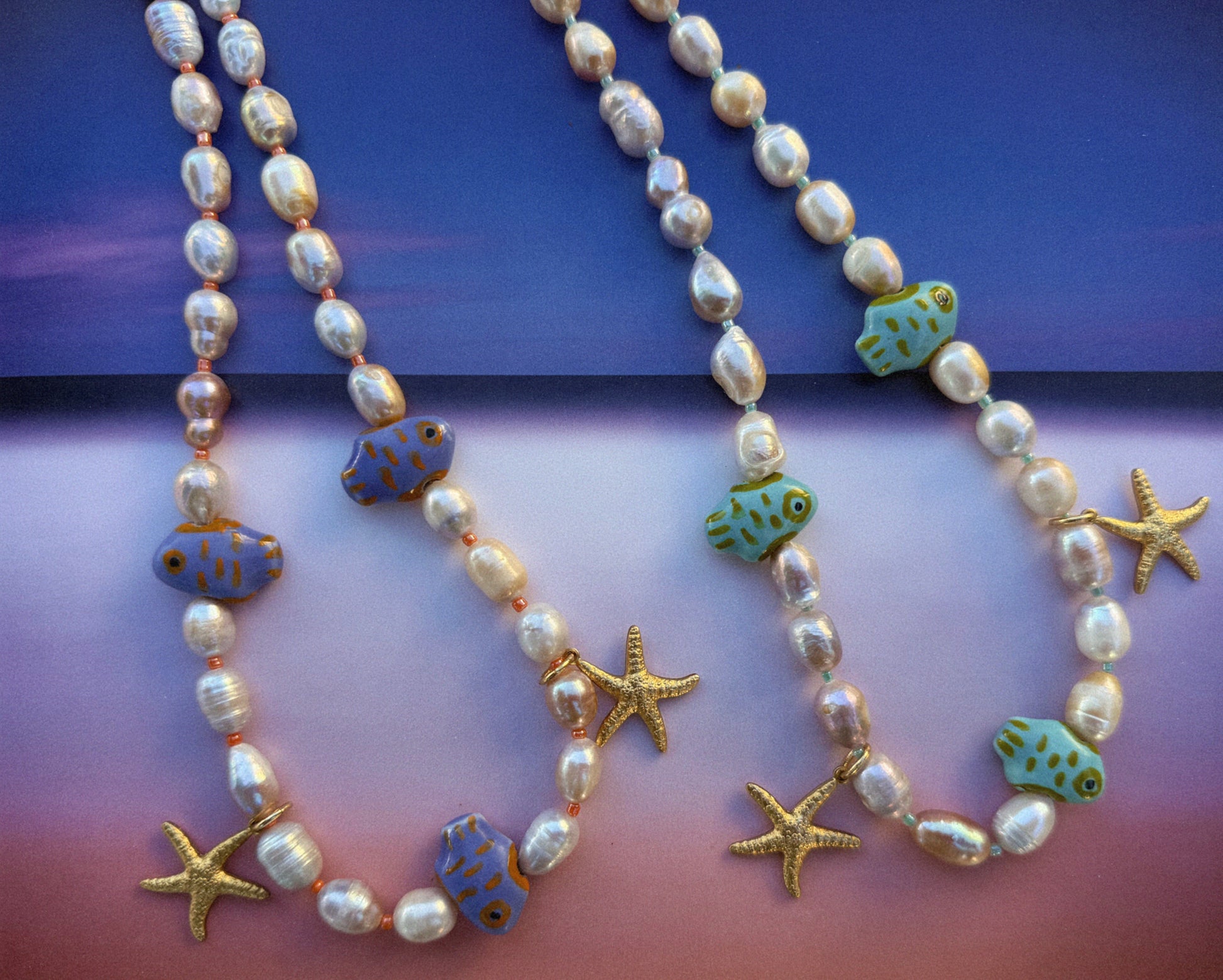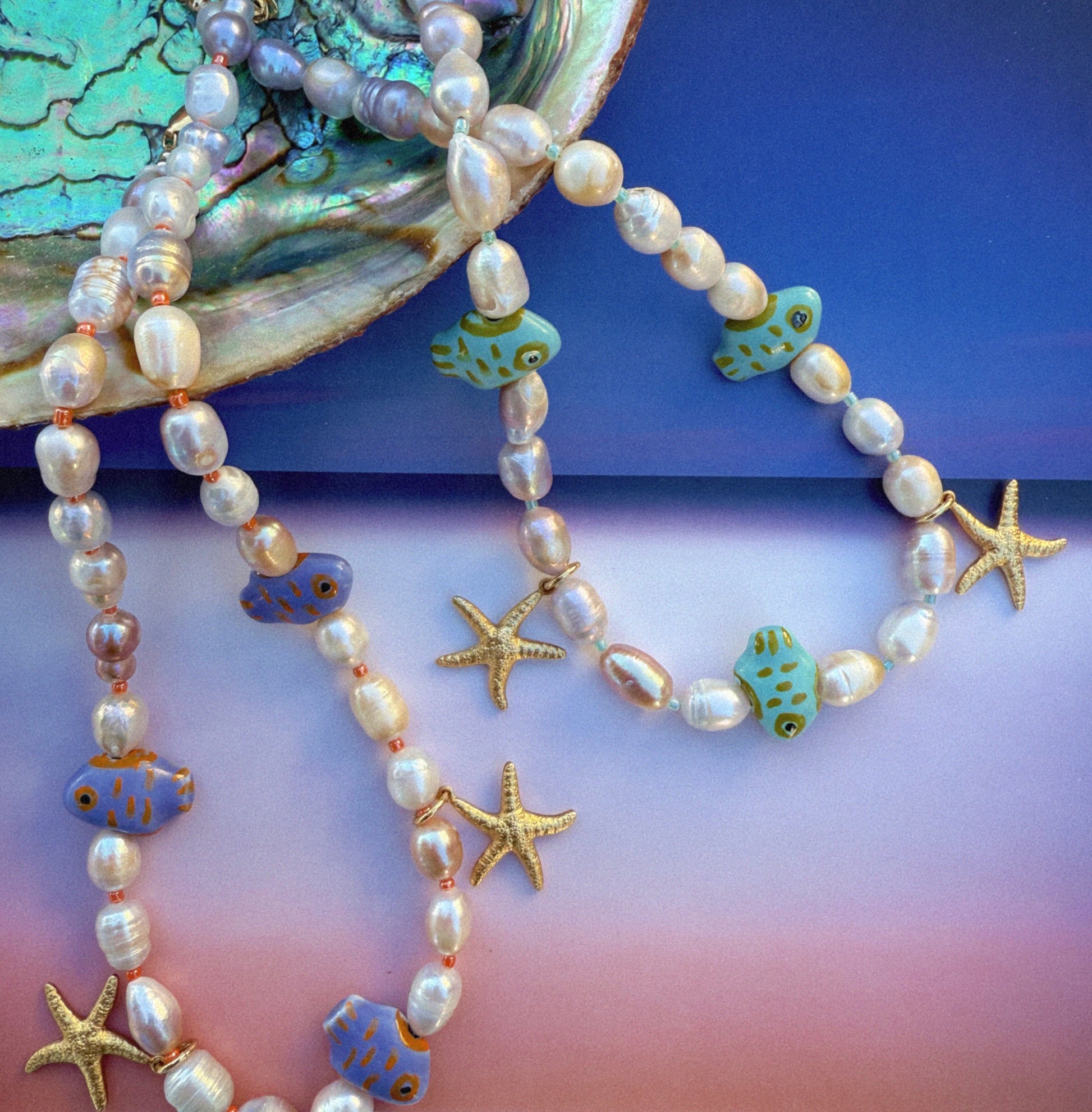 Chunky pearls, bold teal ceramic fish, and golden starfish for the deep-sea dreamer with a cowgirl soul.