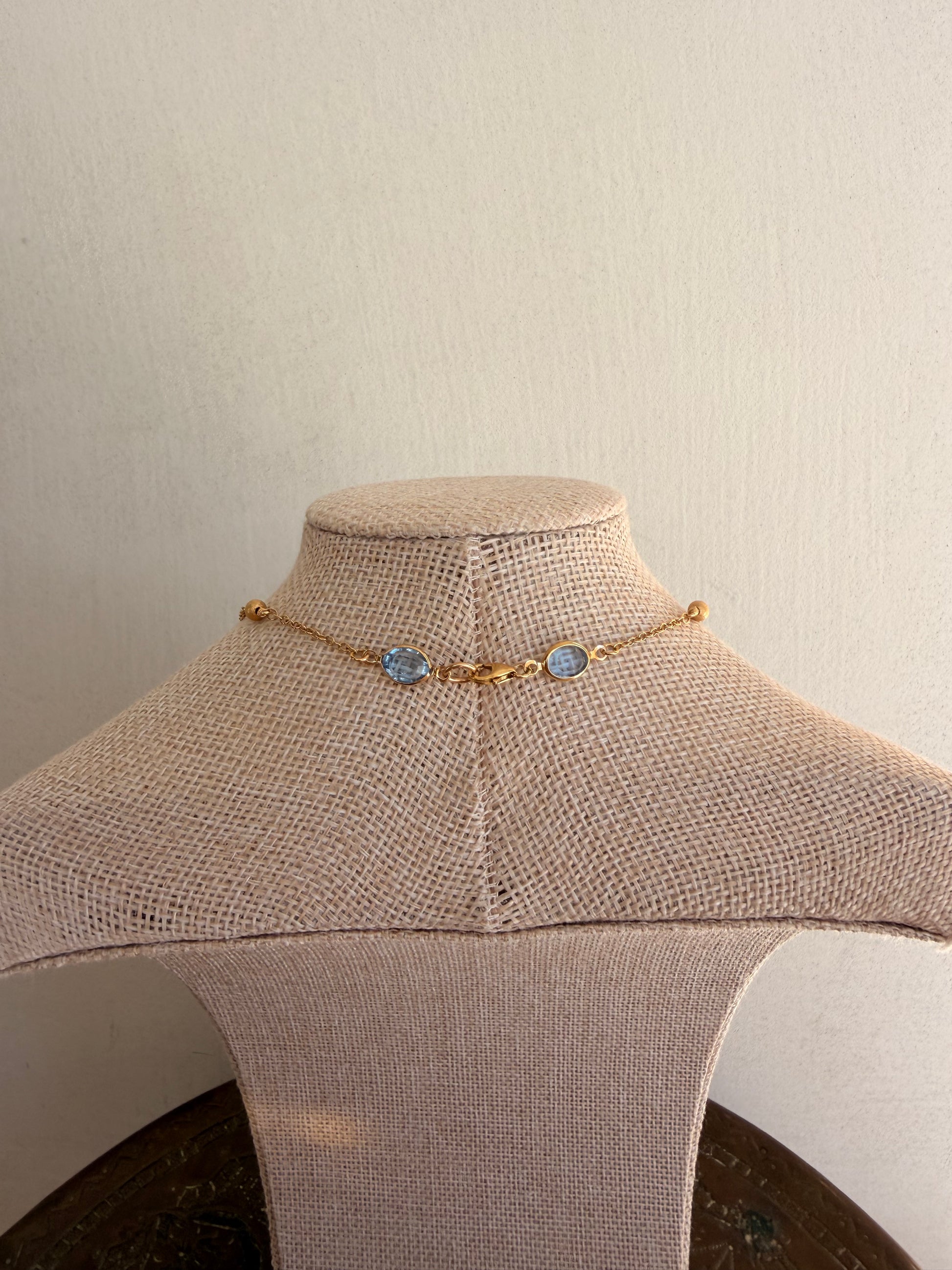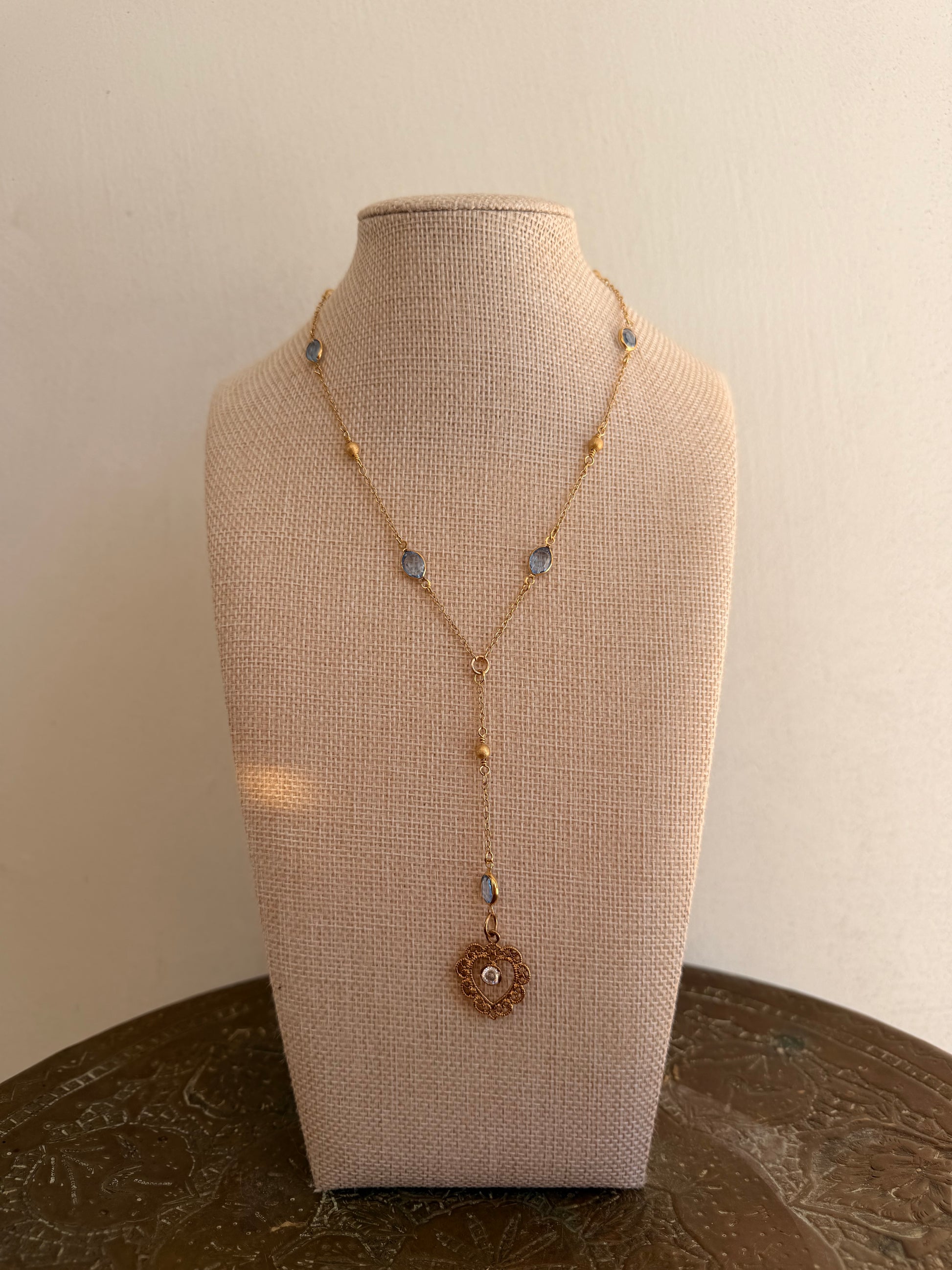 24k gold-filled lariat chain with soft blue crystal accents and a vintage inspired heart drop